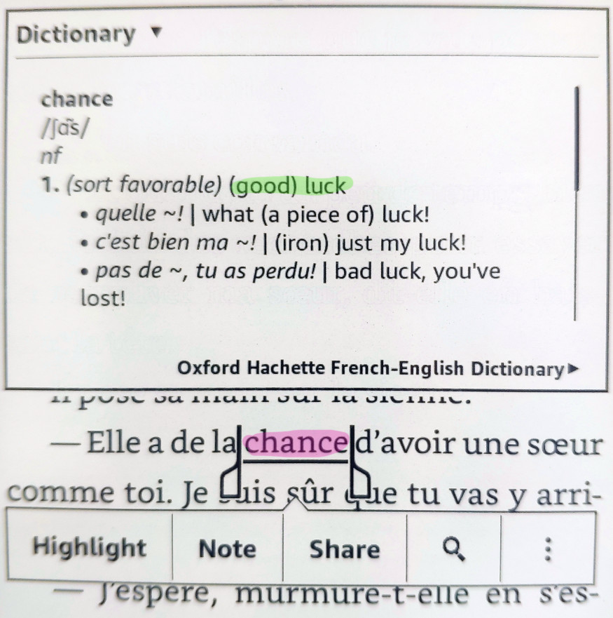Chyba najbardziej przydatną funkcją jest tłumaczenie całych wyrażeń i całych zdań. Urządzenie wykorzystuje serwis Bing Translate do tłumaczenia zaznaczonych fragmentów tekstu. Niestety, aktualnie nie możemy tłumaczyć na język polski (postaram się napisać do Amazonu, aby dołączyć język polski do tej funkcji). Jeśli jednak znamy jakiś inny, popularny język obcy, możemy skorzystać z tej funkcji. Sam uczę się aktualnie francuskiego i tłumaczę zdania na język angielski, który już znam: